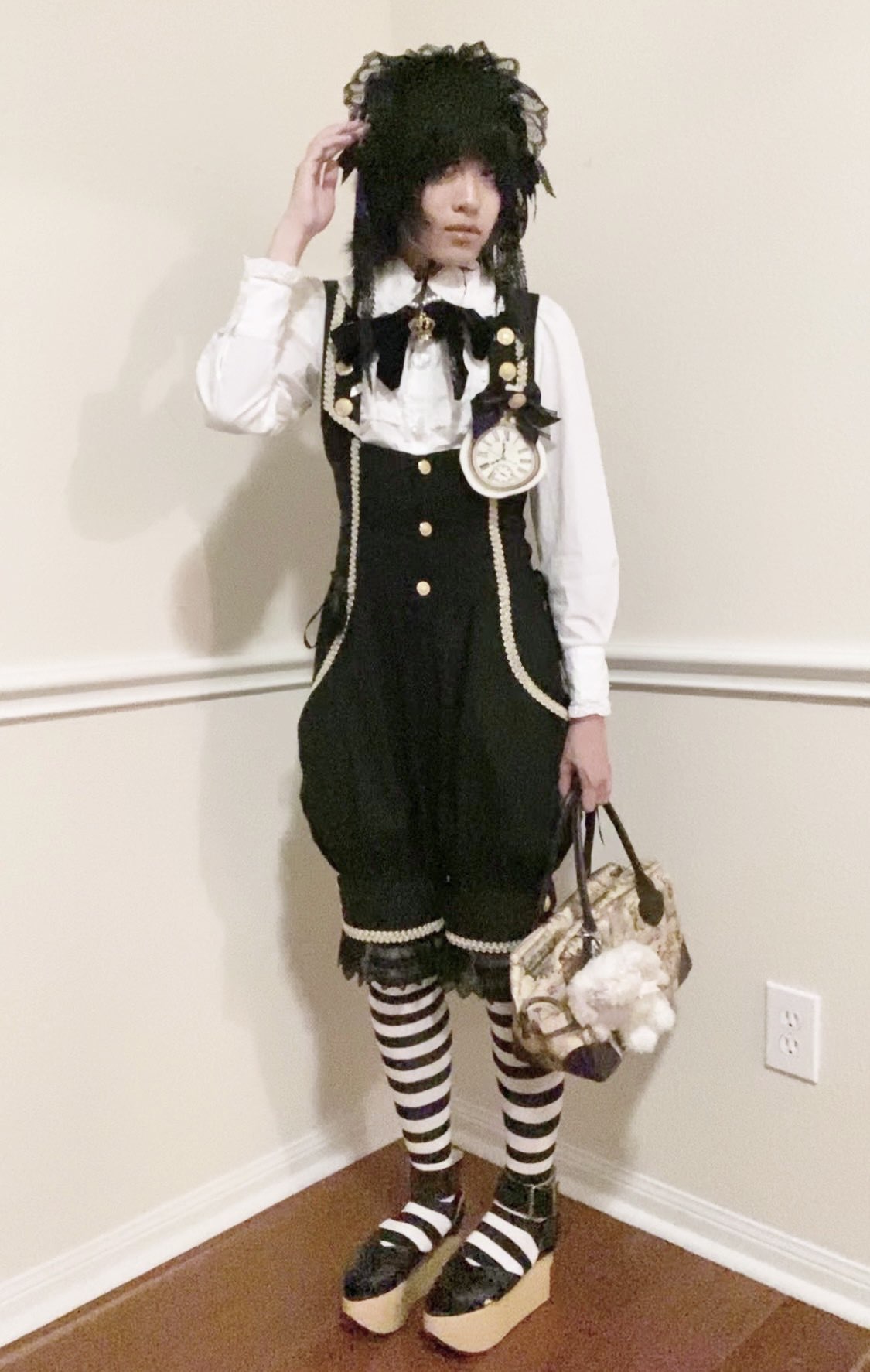 2025.11.30Most AATP productions are designed for gothic taste, but they'll occasionally release items that lean more into the youthful themes and かわいい iconography of ouji. The apple doesn't fall far from the tree. With WRS, its theme is the Rabbit's pocketwatch. I think "sweet" is distinct from gothic ouji by construction and texture regardless of colors as many have been lead to believe. Even though it's black, it's not sleek nor regal like the common goth ouji. Sweet ouji does not need texture to be striking. When it strikes, it does so by invoking pop culture such as Alice In Wonderland. That being said, WRS is a very soft and resilient piece with a breathable rayon-poly blend (so yes, I wear it during the summer.) |