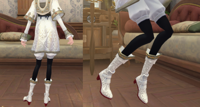 Just look at the oversize fit of that tunic. The delicate laces on her cuffs. The heel soles. The only thing I'd change is to make her chunk highlights and tights the same color black, but otherwise it's a very cute costume.