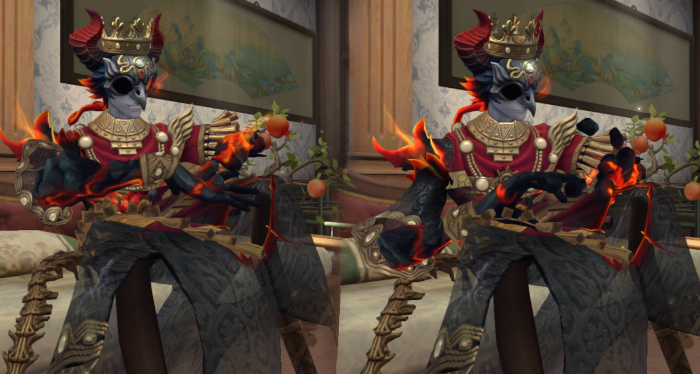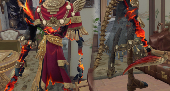 His snake and raven motifs are divided across his costume rather than designed in unity, a testament to Marquis Aamon's duality; All the snake related details are on his back while his raven decorations sit proudly on the front.