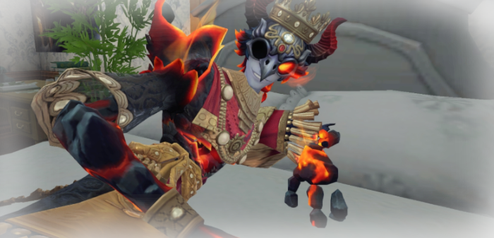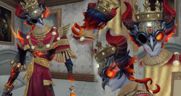 In most depictions Marquis Aamon retains the body of a wolf with a bird's head and dog's teeth. Something I like about this costume is despite having zero canine motifs and only snake or raven embellishments, Fool's Gold himself is a substitute for the wolf's teeth under Aamon's beak. Prospector was commonly paired with themes of birds and rodents in past, or generally small creatures. After Fool's Gold's debut, a couple of Norton's cosmetics have slowly introduced canines into the picture such as Dazzling Lone Wolf and Apex.