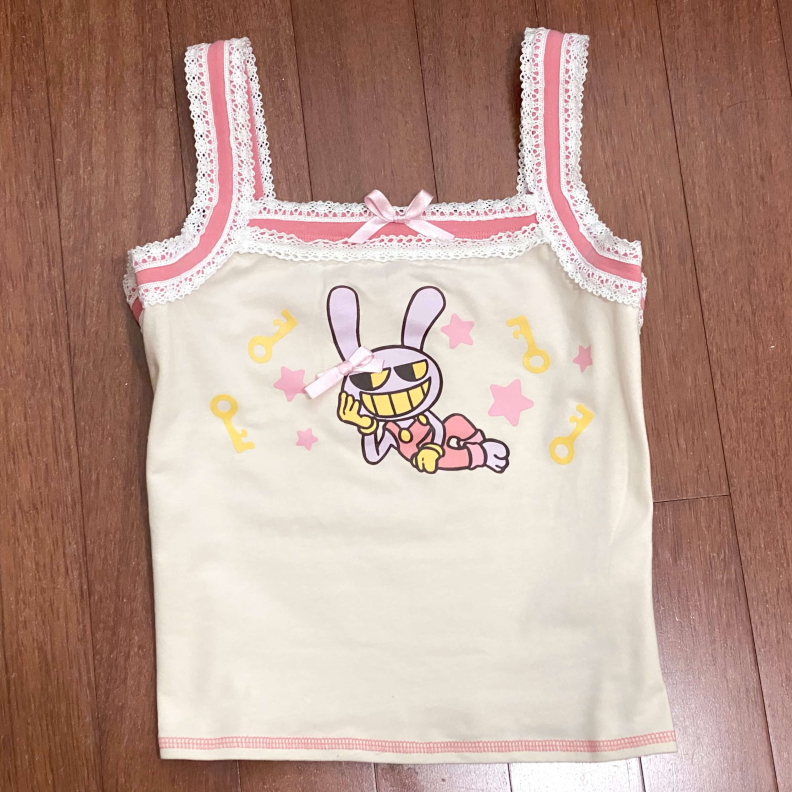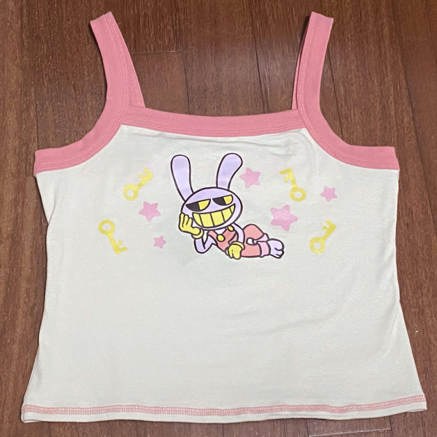 i like clothes in these types of cuts from brands cocolulu and super lovers, so this camisole is fixed to be coordinated with this kind of style. i drew pomni wearing it too. i hope they make a pomni tank so i can put lace on that one too and draw jax matching with her.